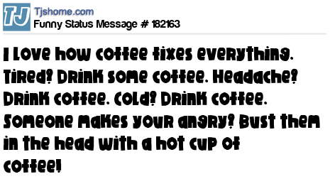 - # 166064 I love how coffee fixes everything. Tired? Drink some coffee. Headache? Drink coffee. Cold? Drink coffee. Someone makes your angry? Bust them in the head with the cup!!!