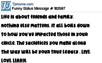 X Life is about friends and family, nothing else matters. it all boils down to how you've impacted those in your circle. The sacrifices you make along the way will be your true legacy . LIVE, LOVE, LEARN.