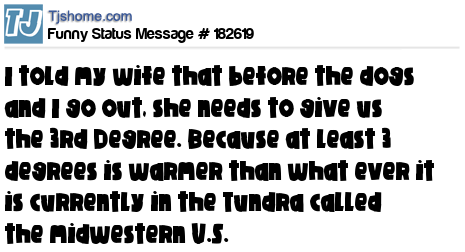 X  I told my wife that before the dogs and I go out, she needs to give us the 3rd Degree. Because at least 3 degrees is warmer than what ever it is currently in the Tundra called the midwestern U.S.