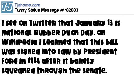 X says I see on Twitter that January 13 is National Rubber Duck Day. On Wikipedia I learned that this bill was signed into law by President Ford in 1975 after it barely squeaked through the senate.