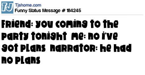 X says friend: you coming to the party tonight me: no i've got plans narrator: he had no plans