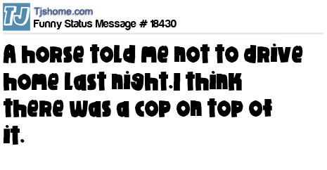 - # 20701 Last night a horse came up to me and told me not to drive home................... Now that I think about it, there might have been a cop sitting on top of it.