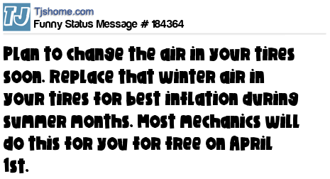 Make sure they use the red (summer time) can air and not the blue (winter time) can air when they inflate your tires. And have a nice April fools day :-)