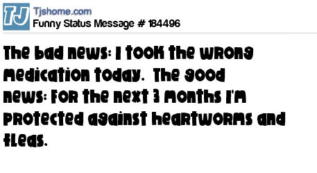 X says The bad news: I took the wrong medication today. The good news: For the next 3 months I'm protected against heartworms and fleas.