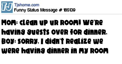 - # 176559 Mom: Clean up your room. We have company coming over for dinner. Me: And we're all going to eat in my room?