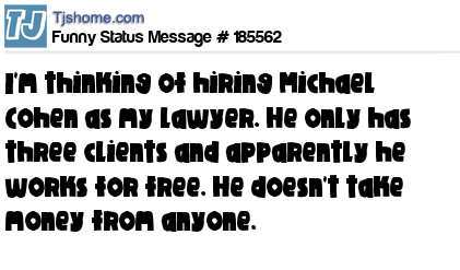 X is I'm thinking of hiring Michael Cohen as my lawyer. He only has three clients and apparently he works for free. He doesn't take money from anyone.