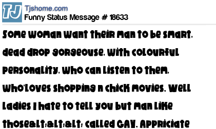 X says some woman want their man to be smart, dead drop gorgeouse, with colourful personality, who can listen to them, who'loves shopping n chick movies. Well ladies I hate to tell you but man like those<<< called GAY. Appriciate a guy for who he is.
