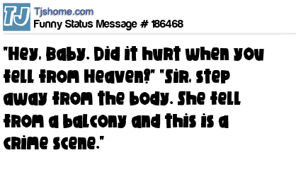 X says "Hey, Baby. Did it hurt when you fell from Heaven?" "Sir, step away from the body. She fell from a balcony and this is a crime scene."