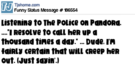 X says Listening to The Police on Pandora. ...."I resolve to call her up a thousand times a day." ... Dude, I'm fairly certain that will creep her out. (Just sayin'.)