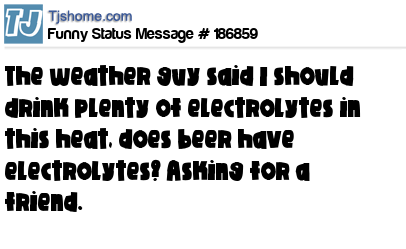 - # 64639 told my son he should drink plenty of electrolytes in this heat, he responded by asking me if I drink beer for the electrolytes