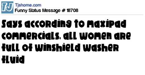 - # 88889 According to maxipad commercials, all women are full of winshield washer fluid...please do not sit on the hood of a mans car...