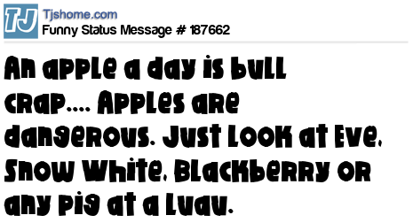 - # 132111 An apple a day is bullcrap. Apples are dangerous. Just look at Eve, Snow White, Blackberry or any pig at a luau.