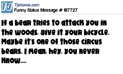 - # 160342 If a bear tries to attack you in the woods, give it your bicycle. Maybe it's one of those circus bears, you never know.