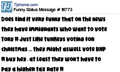 X does find it very funny that on the news they have immigrants who want to vote Tory !! just like turkeys voting for christmas ... they might aswell vote BNP !! buy hey , at least they won`t have to pay a higher tax rate !!