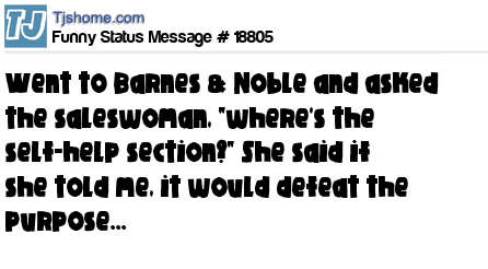 - # 5631 I went to the bookstore and asked the saleswoman where the Self Help section was. She said if she told me it would defeat the purpose.