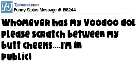 - # 173315 To whoever has my voodoo doll, please scratch between my butt cheeks. I'm out in public. Thanks.