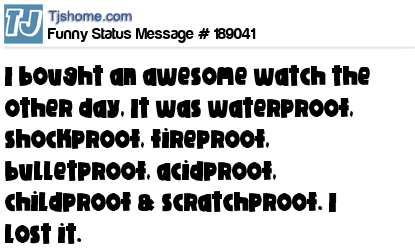 X says i bought an awesome watch the other day, It was waterproof, shockproof, fireproof, bulletproof, acidproof, childproof & scratchproof. I lost it.