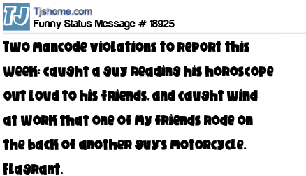 - # 56781 3 man code violations to report this week..1) seen a guy drinkin a can a diet pepsi with a straw 2) heard that two guys rode to work together on the same motorcycle 3) seen a guy driving a mini van with a doo rag on