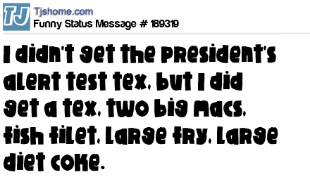 X is I didn't get the president's alert test tex, but I did get a tex, two big macs, fish filet, large fry, large diet coke.