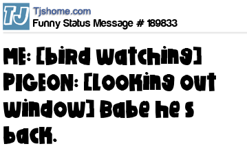 X says ME: [bird watching] PIGEON: [looking out window] Babe he’s back.
