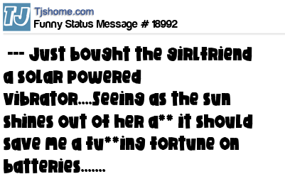 X --- Just bought the girlfriend a solar powered vibrator....Seeing as the sun shines out of her a** it should save me a fu**ing fortune on batteries.......