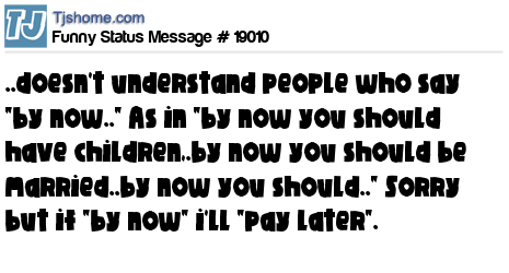 X ..doesn't understand people who say "by now.." As in "by now you should have children,.by now you should be married..by now you should.." Sorry but if "by now" i'll "pay later".
