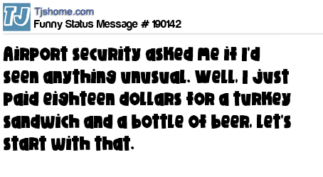 X says Airport security asked me if I'd seen anything unusual. Well, I just paid eighteen dollars for a turkey sandwich and a bottle of beer, let's start with that.