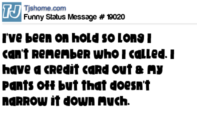 - # 24895 Been on hold so long I forgot who I called. Got a credit card out and my pants off but that doesn't narrow it down much.