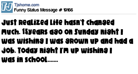 X just realized life hasn't changed much. 15years ago on Sunday night I was wishing I was grown up and had a job. Today night I'm up wishing I was in school.......