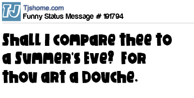 - # 186721 "Shall I compare thee to a Summer's Eve? For thou art a Douche." -Rejected Shakespeare line.