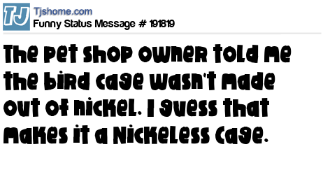 X is The pet shop owner told me the bird cage wasn't made out of nickel. I guess that makes it a Nickeless Cage.