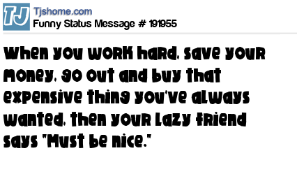 X says When you work hard, save your money, go out and buy that expensive thing you've always wanted, then your lazy friend says "Must be nice."