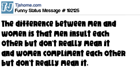 X says The difference between men and women is that men insult each other but don't really mean it and women compliment each other but don't really mean it.