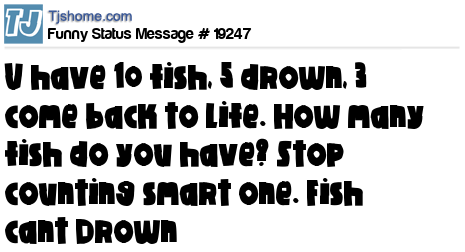 - # 48609 U have 10 fish, 5 drown, 3 come back to life. How many fish do you have? Stop counting smart one Fish cant Drown.