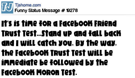 X It's is time for a Facebook Friend Trust Test...Stand up and fall back and I will catch you. By the way, the Facebook Trust Test will be immediate be followed by the Facebook Moron Test.