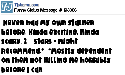 X says Never had my own stalker before. Kinda exciting, kinda scary. 2½ stars - might recommend.* *mostly dependent on them not killing me horribly before I can