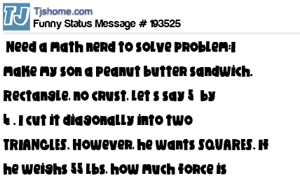 - # 193526 Need a math nerd to solve problem: I make my son a peanut butter sandwich. Rectangle, no crust, I cut it diagonally into two TRIANGLES. he wants SQUARES. If he weighs 55 lbs, how much force is needed to launch him into the sun
