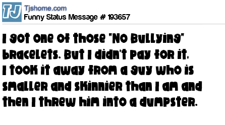X says I got one of those "No Bullying" bracelets. But I didn't pay for it, I took it away from a guy who is smaller and skinnier than I am and then I threw him into a dumpster.