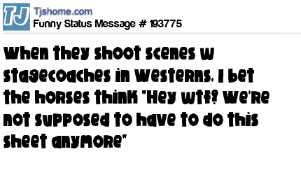 X says When they shoot scenes w stagecoaches in Westerns, I bet the horses think "Hey wtf? We're not supposed to have to do this sheet anymore"