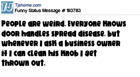 X says People are weird. Everyone knows door handles spread disease, but whenever I ask a business owner if I can clean his knob I get thrown out.