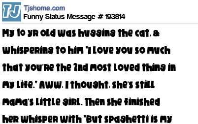 X says My 10 yr old was hugging the cat, & whispering to him "I love you so much that you're the 2nd most loved thing in my life." Aww, I thought, she's still mama's little girl. Then she finished her whisper with "But spaghetti is my favorite thing."