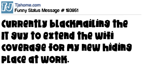 X says Currently blackmailing the IT guy to extend the wifi coverage for my new hiding place at work.