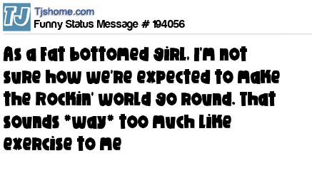 X says As a Fat bottomed girl, I'm not sure how we're expected to make the Rockin' world go round. That sounds *way* too much like exercise to me