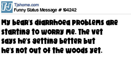 X says My bear's diarrhoea problems are starting to worry me. The vet says he's getting better but he's not out of the woods yet.