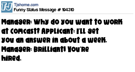 X says Manager: Why do you want to work at Comcast? Applicant: I'll get you an answer in about a week. Manager: Brilliant! You're hired.
