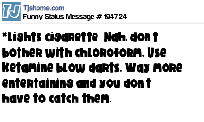 X says *lights cigarette Nah, don’t bother with chloroform. Use Ketamine blow darts. Way more entertaining and you don’t have to catch them.