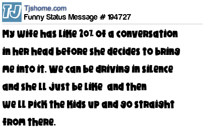 X says My wife has like 20% of a conversation in her head before she decides to bring me into it. We can be driving in silence and she’ll just be like “and then we’ll pick the kids up and go straight from there.”