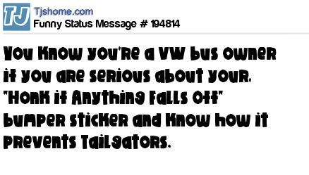 - # 195565 You know your a Volkswagen bus owner when you know how that your "Honk if Any Parts Fall Off" sticker also prevents tailgators.