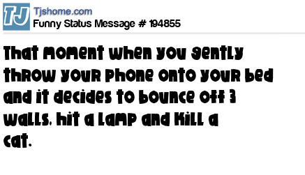 - # 113699 That moment when you gently throw your phone onto your bed and it decides to bounce off 3 walls, hit a lamp, and kill a cat.