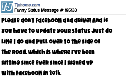 X is Please don't Facebook and drive! And if you have to update your status just do like I do and pull over to the side of the road, which is where I've been sitting since ever since I signed up with Facebook in 2014.